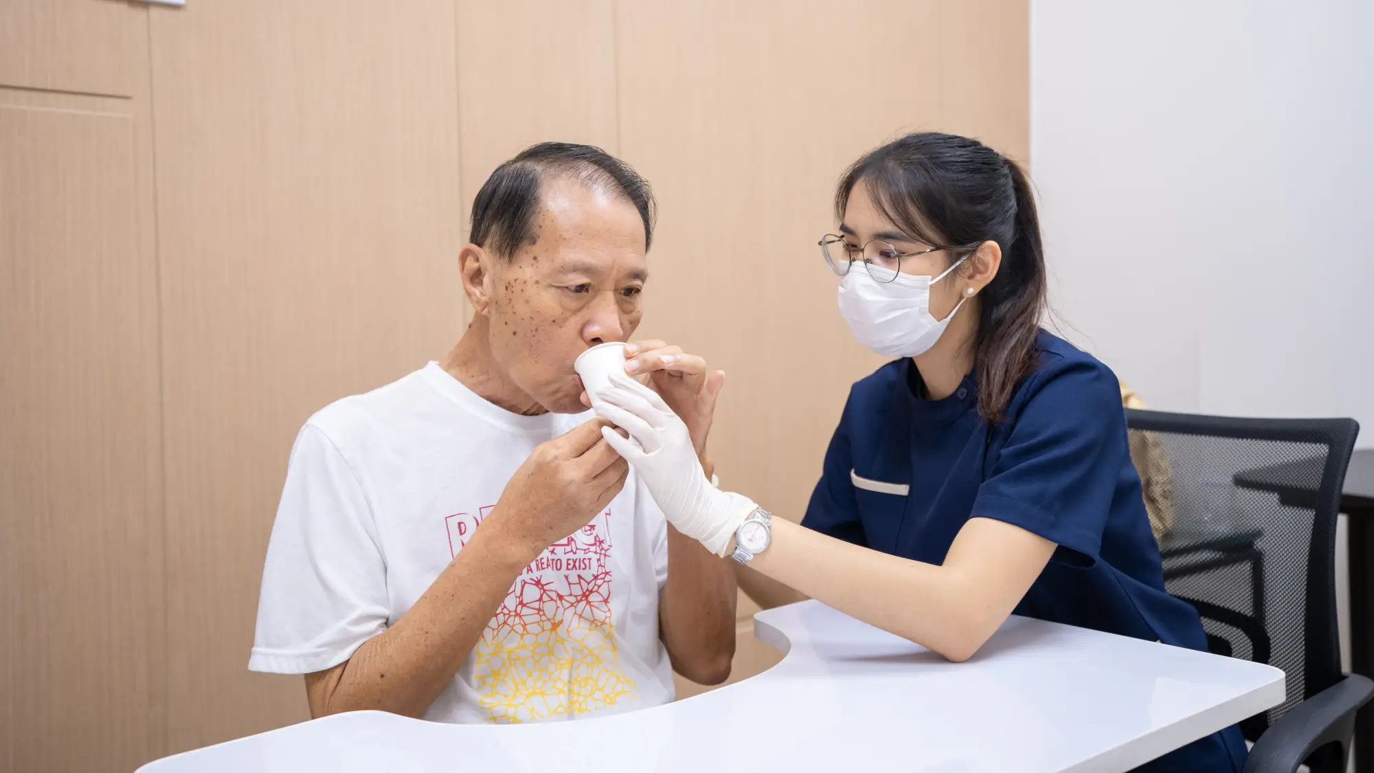 “แรก ๆ คุณพ่อให้อาหารทางสายยางทุกมื้อ ตั้งแต่ฝึกมา คุณพ่อไม่เคยสำลักเลย ยาเม็ดเป็นแคปซูลสามารถกลืนได้ พอดีขึ้นก็ทานอาหารทางปากได้เลย"