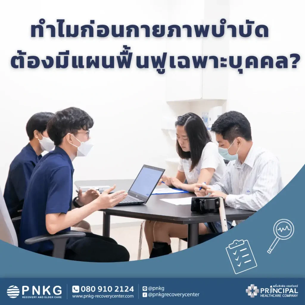 เพราะว่าการฟื้นฟูไม่มีสูตรสำเร็จ ผู้ป่วยแต่ละคนจึงต้องมีแผนการฟื้นฟูเฉพาะบุคคล เพื่อช่วยให้การฟื้นฟูเป็นไปอย่างมีประสิทธิภาพ ที่ศูนย์ PNKG Recovery and Elder Care เราให้ความสำคัญกับการรับประทานอาหาร การดื่มน้ำ การขับถ่าย และการออกกำลังกายของผู้เข้ารับการฟื้นฟู ซึ่งแน่นอนว่าความสามารถของแต่ละคนจะไม่เหมือนกัน