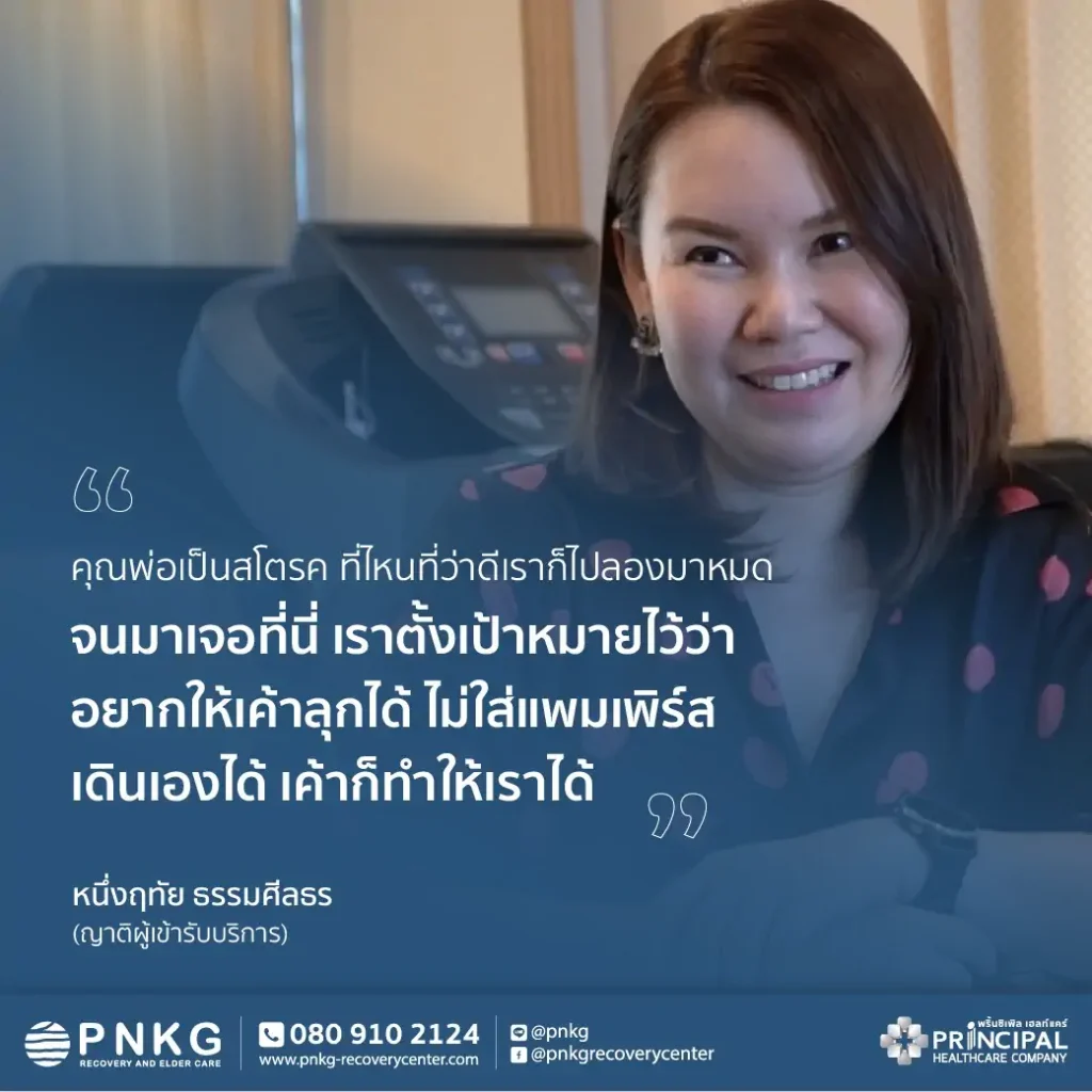 “ตอนคุณพ่อเป็นสโตรก ตอนนั้นวิกฤติมาก สภาพหดหู่ จริง ๆ แล้วพ่อดื้อมากนะคะ แต่ที่นี่คุณพ่ออยู่ได้ 47 คืน ตอนแรกคุณพ่อเหมือนตุ๊กตาล้มลุกเลยค่ะ ลุกนั่งไม่ได้เลย ต้องมีคนดันไว้ ถ้าปล่อยก็คือล้ม อยากให้คุณพ่อหาย อะไรว่าดี เราก็พาคุณพ่อไปรักษา ทั้งฝังเข็ม จี้ไฟฟ้า หลอกเขาไปทำสารพัด ก็ยังไม่หาย พอดีขับรถผ่าน เห็นบิลบอร์ดของโรงพยาบาลเกี่ยวกับการทำกายภาพบำบัด เลยลองติดต่อมา สิ่งแรกที่รู้สึกเลย คือ ที่ศูนย์เอาใจใส่มาก เราเลยตัดสินใจเปลี่ยนมารักษาที่นี่”